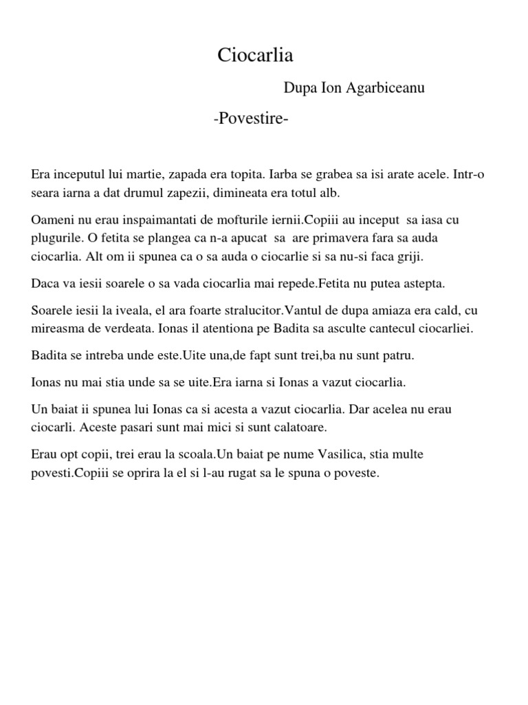 Uurrrggeeennnttt Povestirea Ciocarlia De Ion Agarbiceanu De Aici Va Rooogggg Sau Coronița Brainly Ro