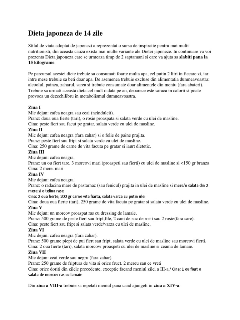 Daca va chinuie foamea beti apa cel putin 2 l zi. Dieta de 14 zile care promite pierderea a 8 10 kilograme. Pe termen lung aceasta dieta are efecte excelente varza avand o cantitate redusa de grasimi si fiind bogata in fibre alimentare. Pentru a scăpa de kilogramele în plus acumulate în ultima perioadă puteți încerca regimul dukan care promite pierderea a 10 kilograme în 14 zile.