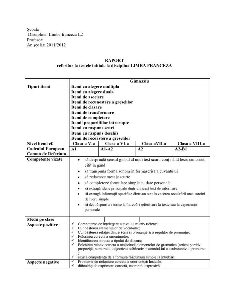 Doc Interpretarea Rezultatelor Testului De Evaluare Iniţială La Limba Franceza Vasile Anca Academia Edu