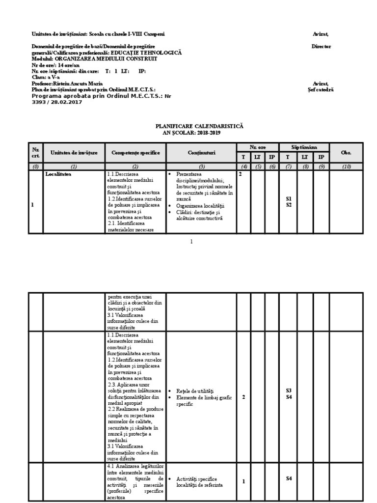 Planificare Calendaristica Clasa A V A Educatie Tehnologica