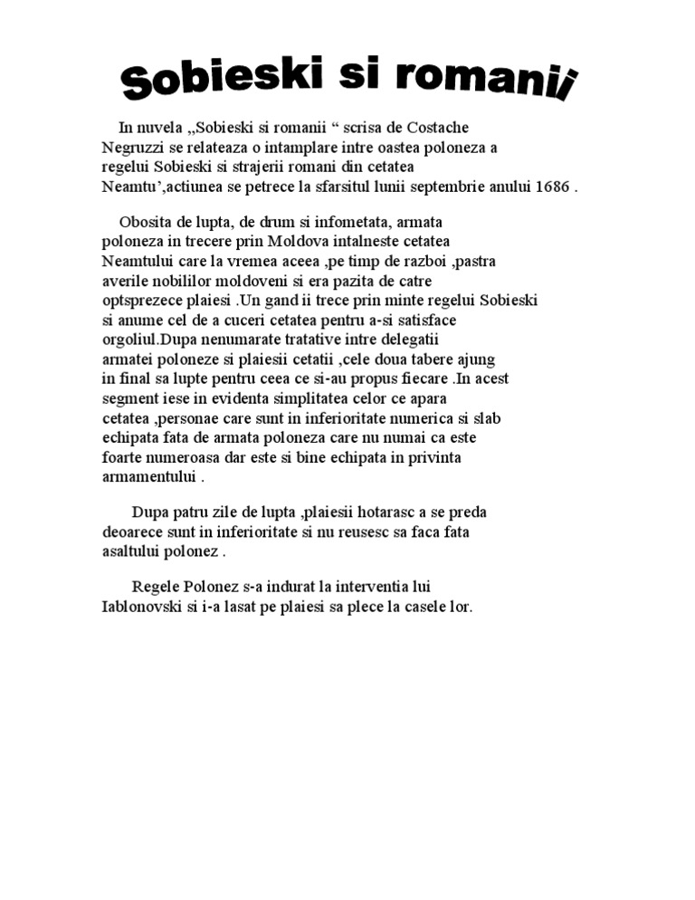 Rezumat Sobieski Si Romanii Costache Negruzzi Clasa 6