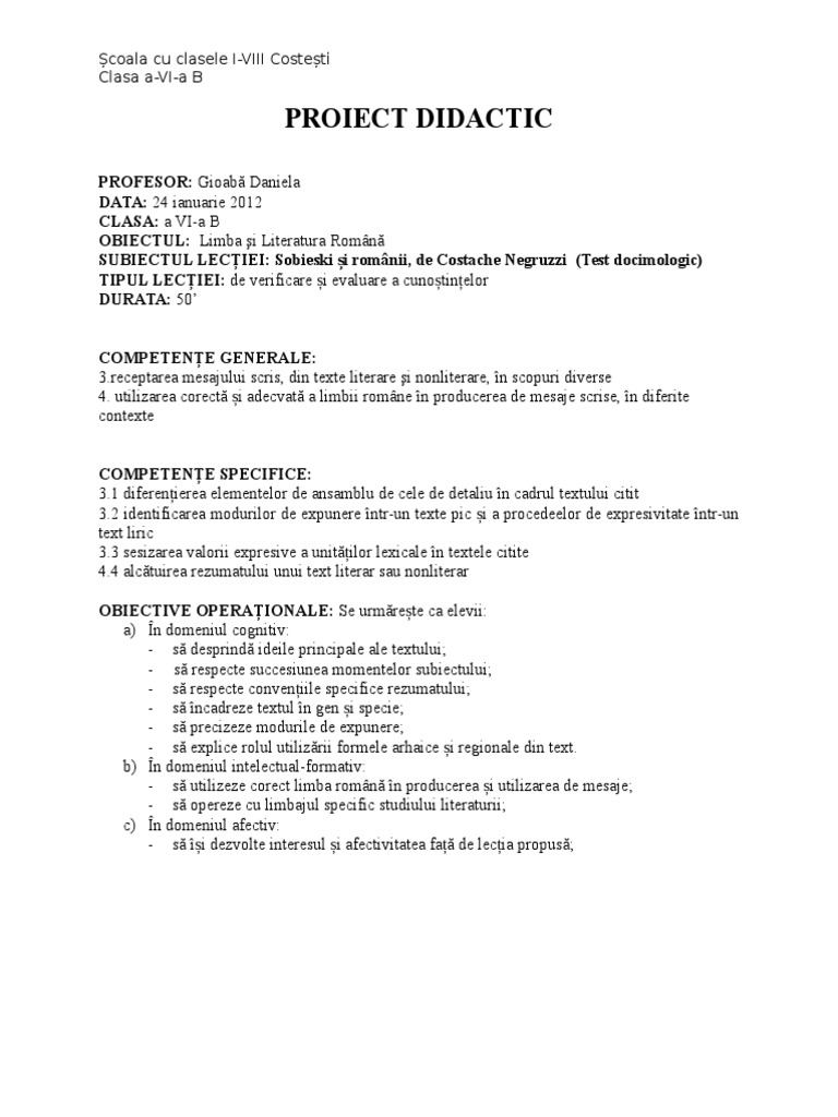Proiect Proiect De Lectie Sobieski Si Romanii De Costache Negruzzi Momentele Subiectului Romana 382641