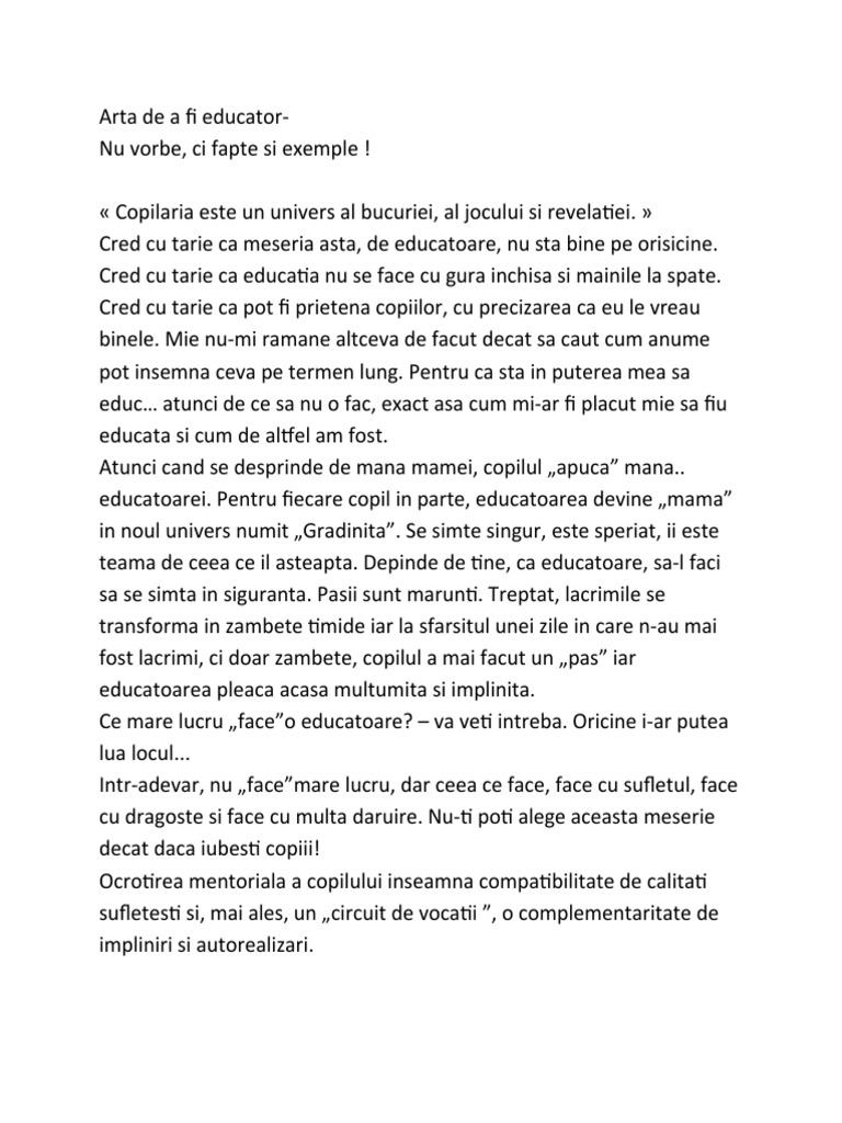 Sa respecte oamenii sa fie toleranta cu cei din jur sa nu judece sa fie altruista sincera cinstita. Percepe arta ca pe o experiență și o descifrează ca fiind pâinea caldă care adună în jurul său oameni care vor să își trezească. Artista o trece prin inima sa pentru a i mulțumi lui dumnezeu pentru harul cu care a binecuvântat o. Prima si cea mai importanta trasatura necesara pe care mi as dori sa o aiba este convingerea ca poate deci neaparat vreau sa aiba incredere in fortele proprii.